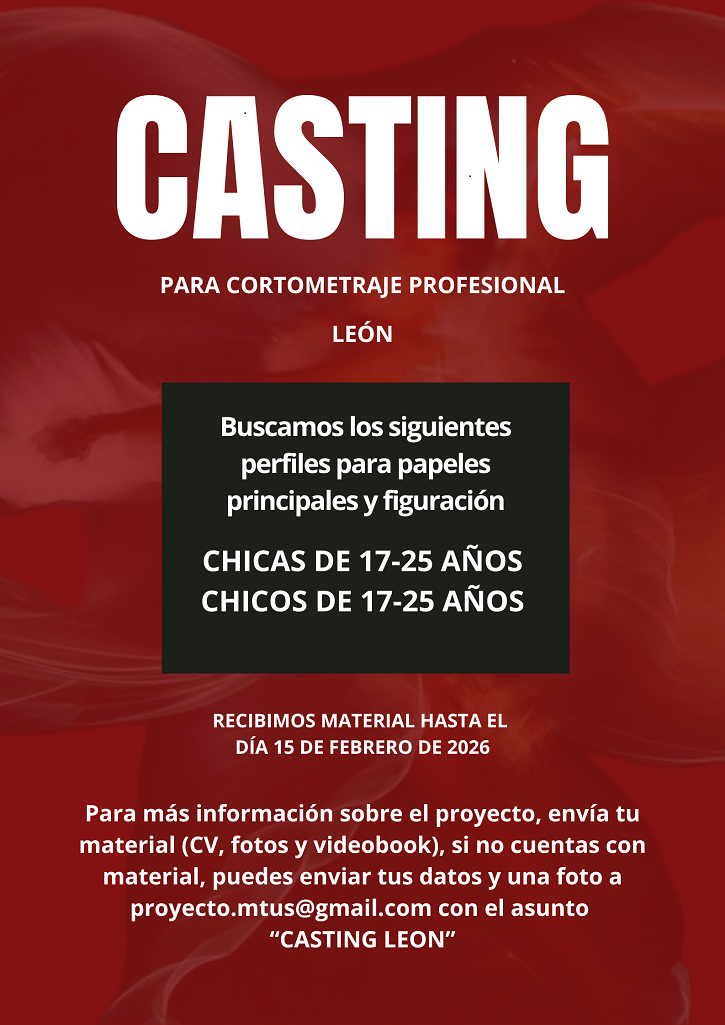 Más información sobre el proyecto: Envía tu material (CV, fotos y videobook), si no cuentas con material, puedes enviar tus datos y una foto a proyecto.mtus@gmail.com con el asunto: «CASTING LEÓN».