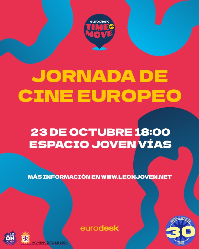 Eurodesk León organiza, en el marco de Time to move, una ‘Jornada de Cine Europeo’, que consistirá en la proyección de un audiovisual sobre Eurodesk –y, en particular, Eurodesk León– y, a continuación, cuatro cortos europeos y uno local; cuyo proceso de selección está ahora mismo en marcha: hasta el próximo 16 de octubre está abierto el plazo de admisión de trabajos, a través de la plataforma Filmmakers (https://filmmakers.festhome.com/festival/9795).
