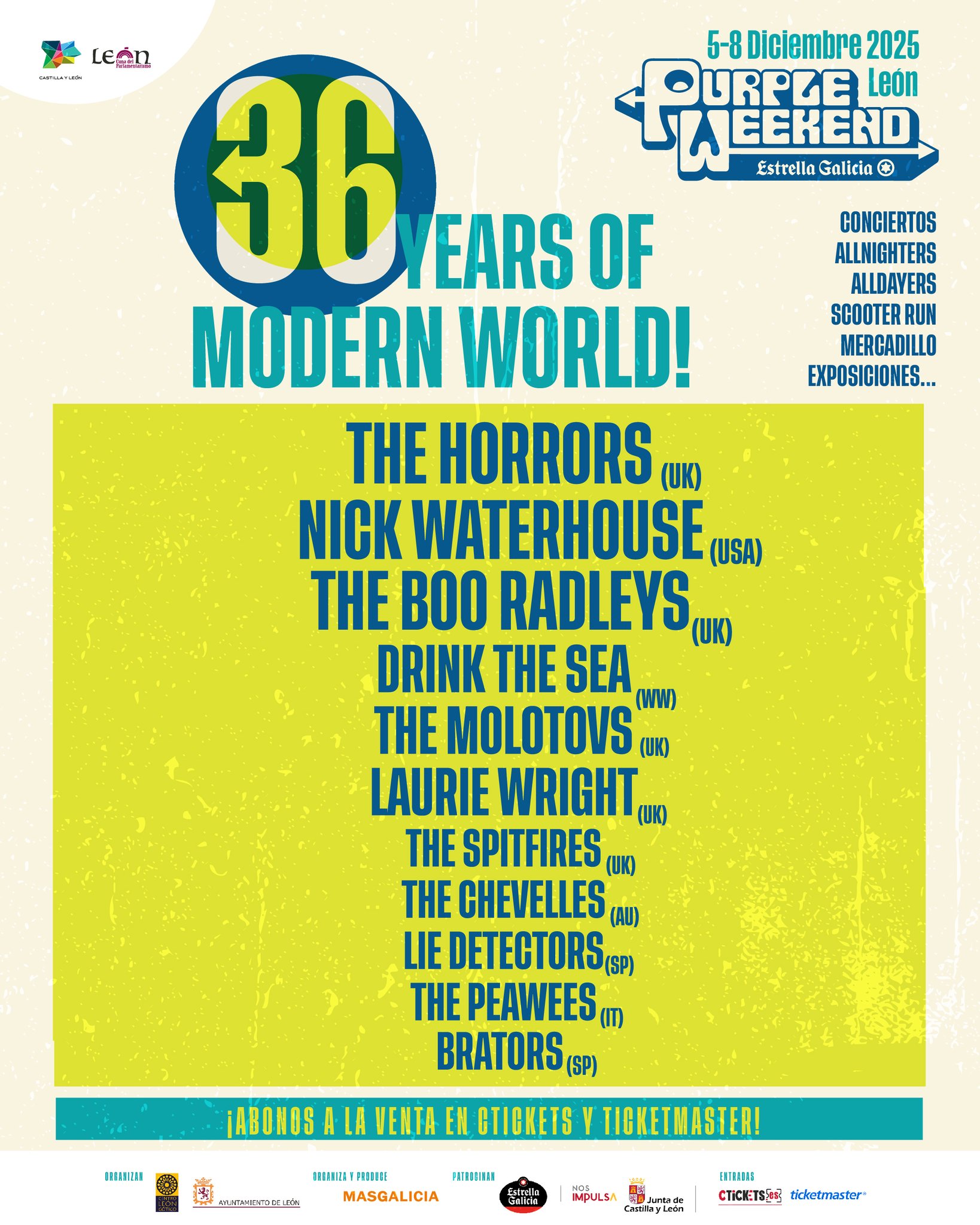 El Purple Weekend Estrella Galicia celebra su 36ª edición del 5 al 8 de diciembre, convirtiendo a León, un año más, en la capital de la escena mod. El festival concentra la mayor parte de su programación musical en Espacio Vías, aunque también habrá actividades, fiestas y sesiones DJ en otros puntos de la ciudad.
