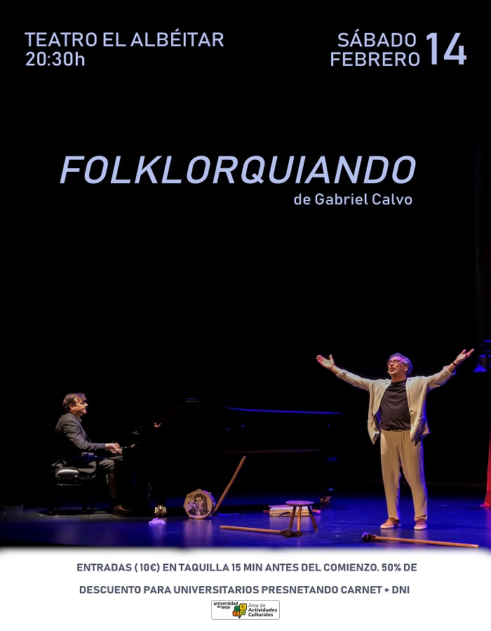 GABRIEL CALVO, insigne folclorista, bululú y trovador español, desanda y reconstruye con exquisita sabiduría el trayecto creativo del poeta, evocando sobre el escenario las resonancias orales que le sirvieron de inspiración; aquellas que, por su huella y significado, acabarían confluyendo luego en la escena de sus cavilaciones teatrales, poemas, montajes escénicos, conferencias y grabaciones sonoras. Ian Gibson el mayor experto en la vida de Lorca ha definido así FOLKLORQUIANDO: “Un trabajo muy bello, me ha conmovido”.