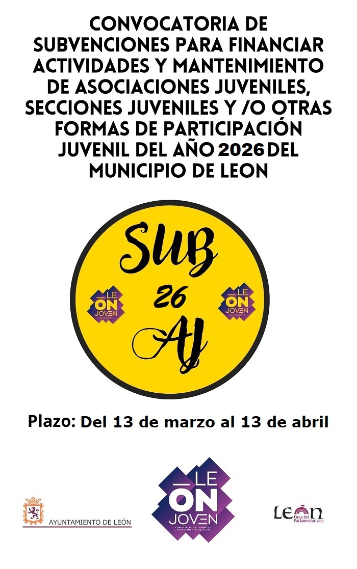Consiste: Subvenciones en régimen de concurrencia competitiva con destino a financiar programas de actividades juveniles y gastos de funcionamiento y mantenimiento general de las asociaciones juveniles, secciones juveniles de otras entidades y/ó demás formas organizadas de participación juvenil cuyo ámbito de actuación sea el municipio de León, para el año 2026.