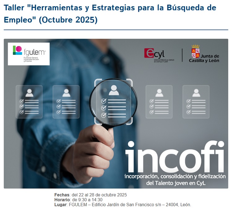 Organiza: Fundación General de la Universidad de León y de la Empresa (FGULEM). Esta iniciativa se enmarca en el proyecto INCOFI, una acción destinada a facilitar la incorporación, consolidación y fidelización del talento joven en el tejido empresarial. Y financiado por el Servicio Público de Empleo de Castilla y León (ECYL).